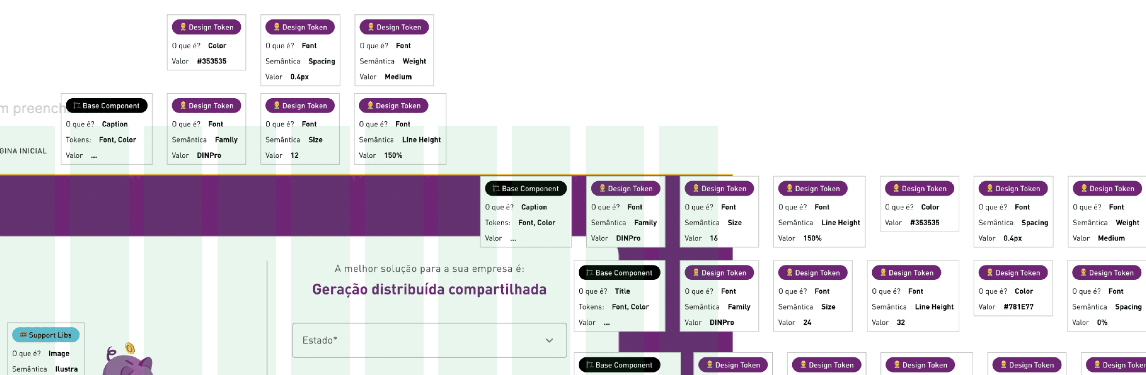 – Core tokens: derivados do Brandbook paleta base e valores primitivos: green-100, purple-500